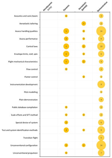 Note that the list in Table 3 only reflects those SFT platforms that, to the best of the authors’ knowledge, have produced scientific publications. In fact, the actual number of relevant SFT projects or platforms is difficult to quantify due to the variety and unreliability of the communication channels used to disclose project information, but it is expected to be significantly higher. Clear examples of this are the numerous demonstrative SFT experiments on novel vertical lift vehicles being carried out by multiple small companies, and SFT of unconventional configurations by other organisations that so far have only been communicated via press releases or the media. Furthermore, despite the explicit definition of SFT given in Section 2.1, the border between UAV development and SFT is sometimes ambiguous. The inclusion or exclusion of certain projects from this list may therefore be subject to discussion.