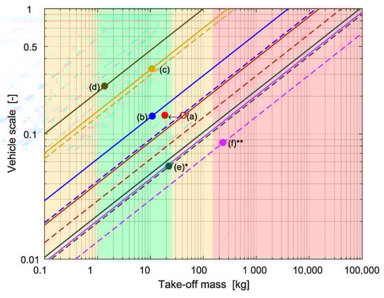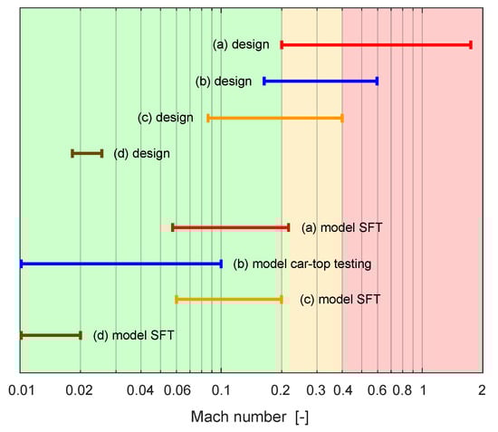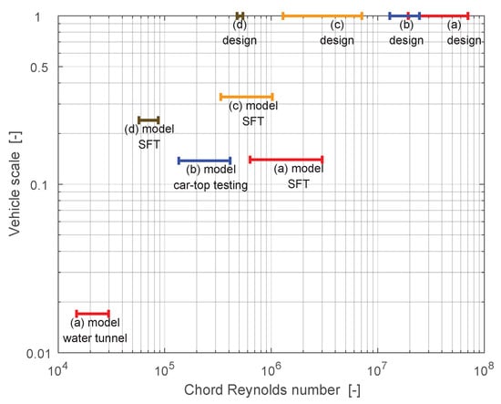 Focusing first on the Reynolds number deviations, this problem is closely coupled to the scale factor of the model since Reynolds number is directly proportional to a characteristic linear dimension, l in Equation (3)(a). Although it could be compensated for by a higher flight speed and air density, these are usually limited by practical testing constraints. Independently of the type of aircraft, a deviation in Reynolds number is therefore unavoidable at small scales, as demonstrated by the different tests shown in Figure 2.