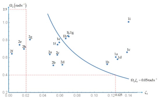 This system can be inverted to specify the and thus the changes (31) in damping ratios and natural frequencies . We have thus obtained three sets of results, indicated in Table 2: (i) the natural frequencies and damping ratios of the decoupled modes Equations (3a,b) and Equations (4a,b) in Table 1; (ii) the natural frequencies and damping ratios of the strongly Equations (9a,b) coupled modes Equations (6a,b); (iii) the natural frequency and damping ratio changes Equations (33, 31) for weak coupling Equations (11a–c).