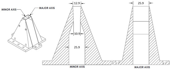 The nozzle aspect ratio in this work is defined as the ratio of the nozzle width to the nozzle height at the nozzle exit (see Equations (4) and (5)). The nozzle exit area (Aexit) is known from the baseline geometry (Figure 2). The baseline geometry is modified to obtain equivalent low and high aspect ratio nozzles by keeping the exit-to-throat area ratio and nozzle-exit equivalent diameter constant. Therefore, the Reynolds number at nozzle exit is the same for all geometries. This created a better reference for comparison by only changing the nozzle aspect ratio and avoiding the Reynolds number effect on the flow. As mentioned previously, the nozzle wall profile is created using a straight line which caused a sharp throat. This gave a total of 5 nozzle geometries with AR = 1, 2, 3 and 8, 12 with design Mach number = 1.5. The goal is to understand the internal flow behavior and jet mixing characteristics at lower and higher ARs than the baseline nozzle, hence the choice of AR.