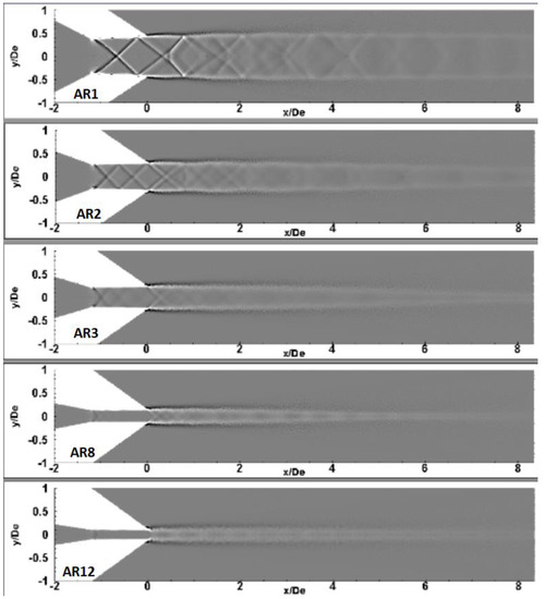 The focus of this subsection is to analyze the shock structure. Figure 3 shows the numerical shadowgraph on the XY symmetry plane for the five nozzle configurations indicating the shock propagation. Note that the scale of the shadowgraph contour plots is adjusted to compare all 5 nozzle geometries in one plot to help compare the low vs. high ARs. Shock cell size reduces with an increase in aspect ratio. This causes more shock reflections inside the nozzle. At high ARs, the shocks become milder as illustrated in Figure 3.