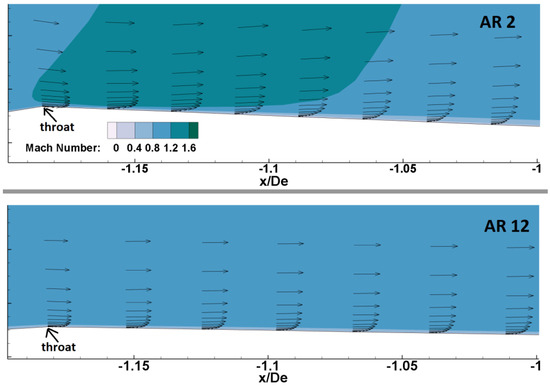 A thicker boundary layer creates more skin friction at the throat which results in higher magnitudes of wall shear stress at low ARs, as shown in Figure 6. This means that the velocity gradient in the boundary layer is larger at low ARs at the throat. At high ARs, the magnitudes of wall shear stress become smaller at the throat due to milder shocks.
