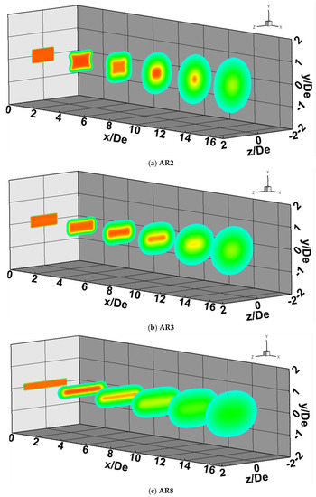 Figure 11 illustrates a 3D perspective of contours of axial velocity (U) normalized by the jet centerline velocity at nozzle exit (Uj) along various X-planes, starting from nozzle exit at x/De = 0 to x/De = 15. The AR2 nozzle exhibits axis switching at around 7–8 De downstream (Figure 11a), therefore, the first three crossflow planes show a memory of the nozzle cross-section, but the last three crossflow planes show a circular shape of the contours. For the AR3 nozzle (Figure 11b), the minor and major axis spread becomes somewhat equal at ~20 x/De. The crossflow planes downstream the high AR nozzles exhibit an elliptical shape of the contours (Figure 11c,d). This means that the axis switching is delayed or virtually nonexistent in high AR cases.