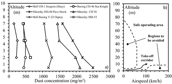 Operative conditions of a rotorcraft: (a) dust concentration profiles over altitude for six helicopter frames [8]; and (b) qualitative reproduction of the height-velocity curve of the Sikorsky S-76 helicopter, adapted from [9].