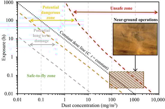Safe-to-fly chart reporting the regions of safe operation, potential long-term damage operation, dangerous operation, and unsafe operation (adapted from [10]). The dashed rectangle reports the typical ground and near-ground conditions encountered by a rotorcraft in dusty sites.