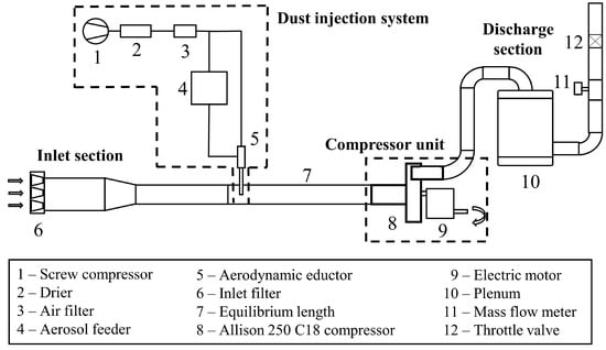 The experimental investigation on particle deposition was carried out on the rotating test bench located in the Fluid Machinery Laboratory of the University of Ferrara, Italy. The test bench mounts the multistage compressor of the Allison 250 C18 engine [22]. A schematic view of the whole engine is reported in Figure 3a, while the picture of the compressor test unit is shown in Figure 3b. The axial part of the compressor unit, thanks to its small size, can be easily dismounted by removing the stator case and allowing direct access to the stator vanes and rotor blades. The pictures of the rotor wheel and stator vanes are reported in Figure 3c,d. A schematic layout of the test facility is reported in Figure 4. The same test bench was used for previous investigations about compressor fouling [14,23] and washing [24,25]. More details are reported there, and the most relevant features are reported here for the sake of completeness.
