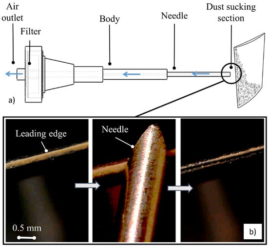 The dust adhered on the compressor vanes and blades after the fouling process was measured employing an purposely designed device, the localized aspirator for particle observation (LAPO). The schematic view of the LAPO is depicted in Figure 5. This device is employed for particle sucking and collection from surfaces. It is driven by a vacuum pump (not shown in Figure 5). Thanks to its characteristics of compactness (100 mm total length) and lightness, the LAPO can be quickly oriented by the operator towards the compressor region to be analyzed. One of the LAPO’s main components is the stainless steel needle, with an outer diameter of 1 mm, which ensures a direct particle sucking from the surface of interest. As shown in Figure 5, the needle, thanks to its thinness, can collect the powder in a very accurate manner from the surfaces. In Figure 5, the deposit collection operation from a leading edge is shown.