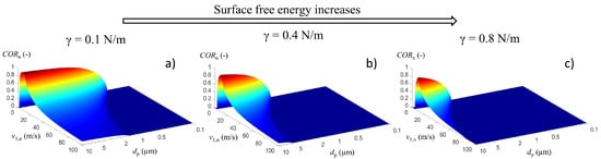 In Figure 6, the surface plot of as a function of the particle diameter and normal impact velocity is proposed. The charts refer to three values of equal to 0.1 N/m (Figure 6a), 0.4 N/m (Figure 6b), and 0.8 N/m (Figure 6c). has been reported for a fixed value of equal to 15 m/s, which is an intermediate value between those reported in [31]. The increase of the surface free energy value leads to an overall decrease of towards null values for the finest particles. This behavior is strictly related to the high value of the work of adhesion obtained for the finest diameter range, which overrides the kinetic energy available for the rebound in Equation (7).