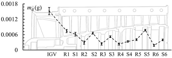 The trend of the mass deposited on the single airfoil (over the stages) is in line with the results reported in [36,37,38]. The fouling rate is higher for the airfoils of the first stages (particularly on the IGV) and decreases over the six axial stages. These observations agree with the literature findings: a higher fouling rate is often detected in correspondence with the machine’s first stage airfoils. In contrast, the airfoils of the aft stages are less affected by the particle deposition issue. The observed trend may be explained by accounting for the different thermodynamic and kinetic effects, which coexist and influence the interaction between the airfoil surface and the particle.