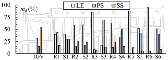 In Figure 8, the percentage of the mass deposited on the leading edge, pressure side, and suction side, concerning the total mass collected from each vane and blade, is shown. Moving from the IGV to the aft stages, the deposit collection increases progressively on the PSs and decreases on the SSs. This effect is higher on the stationary airfoils with respect to the rotating ones. Moreover, a significant increase in the deposits on the leading edge is observed. These effects are strictly related to the fluid dynamic flow field inside the compressor: a well-oriented flow towards the latter stages of the compressor may lead to reduced vane separation phenomena. Similar findings were also observed in the investigation of Tarabrin et al. [37] on the 16 stage axial compressor of the Nuovo Pignone MS5322R.