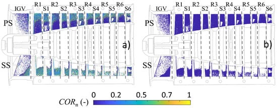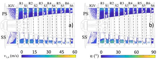 The multi-phase numerical simulation carried out on the axial part of the Allison 250 C18 compressor unit allows obtaining the information related to the impact behavior of the solid particles. Starting from these quantities, the sticking capability on the compressor vanes and blades can be assessed by employing the models reported in Section 2.2. Figure 9 reports the impact location on the airfoils, highlighted according to their normal impact velocity (Figure 9a) and impact angle (Figure 9b). The airfoils’ PSs are almost entirely affected by particle impacts, while the impacts on the SSs are located mostly near the stator case.