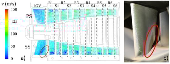 Surface streamlines on the airfoils over the compressor flow-path (a) and the SS of the compressor IGV with the separation zone highlighted (b).