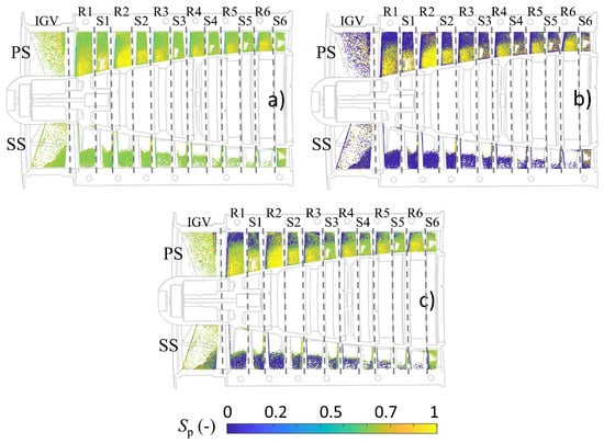 Sticking probability calculated over the compressor stages: (a) silica carbide adhesion (SCA) model; (b) SCA model with critical impact angle in dry conditions; and (c) SCA model with critical impact angle in wet conditions
