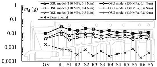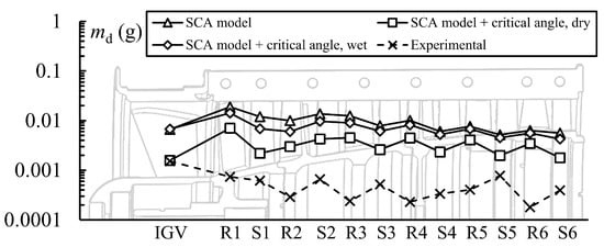 The SCA model (Figure 13) gives lower values of deposits with respect to the OSU model (Figure 14), and the difference increases towards the aft stages of the compressor. This is mainly due to the increase of the particle impact velocity in the compressor’s last stages, leading to the reduction of the sticking probability. In both dry and wet conditions, the addition of the critical angle formulation results in a downward shift of the deposited mass values. In particular, the dry condition gives a significant reduction of the deposited mass, leading to good results, especially on the compressor IGV, whose deposited mass value is close to the experimental finding.