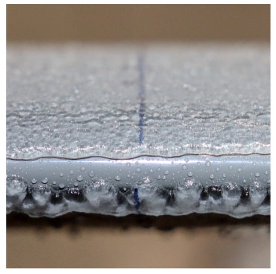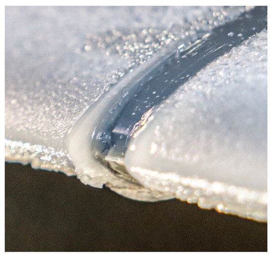 To showcase the effect of the parting strip on ice shedding, a comparison between the conventional system, the parting strip system with deactivated parting strip, and activated parting strip were conducted (Figure 13). The tests were performed at T = −2 °C and tintercycle = 4 min at relatively similar heat fluxes q = [10.5 … 12.5 kW/m2]. The results showed that there is little difference between the conventional system and the deactivated parting strip. The latter shed ice slightly later compared to the conventional system even though it used almost 20% higher heat loads. This was likely related to the unheated gap on the parting strip system (as the parting strip itself was deactivated) which delayed the melting process. The ice/surface interface near the gap needed longer to heat which resulted in the increased shedding time. Also, that area might have been acting as an anchor point of ice, likely reducing aerodynamic shedding efficiency.
