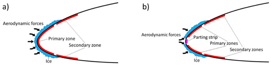 Two D·ICE prototypes were used in this study: a conventional design and a parting strip design. The conventional design (Figure 3a) consisted of one primary heating-zone extending over the leading edge, with a total width of 5 cm. A secondary heating-zone with a width of 5 cm was located on the upper and lower side of the airfoil. The parting strip (Figure 3b) design had two primary zones at the leading edge, each with a width of 2.5 cm and two secondary zones with a width of 5 cm each. A thin heating element acting as a parting strip was located between the two primary zones.