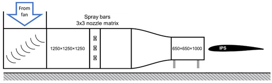 The VTT icing wind tunnel [24] is an open-loop wind tunnel (Figure 4) situated inside a large climate test chamber [25]. The tunnel was originally designed for investigations of wind turbine icing at low velocities, up to a maximum airspeed of v = 50 m/s. The internal test section has a size of 0.65 × 0.65 × 1.0 m. The icing wind tunnel facility can operate in the temperature range of T = −25 … +30 °C. A 3 × 3 spray nozzle grid generates a droplet cloud with a liquid water content range of LWC = 0.1 … 1.0 g/m³ and a median (droplet) volume diameter range of MVD = 12 … 30 μm.