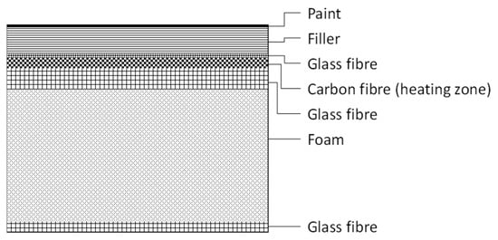 The test wing is a rectangular wing with a chord c = 0.45 m and a span b = 0.65 m. The wing is based on the RG-15 airfoil, which is a low-Reynolds airfoil specifically designed for UAVs and model aircraft. The wing was manufactured from fibre-reinforced epoxy. In this study, we placed the wing at the end of the tunnel for better accessibility to the IPS during testing (Figure 4). The rectangular wing spans the entire test section, and therefore the results are representative of a 2D IPS model. The electrothermal heating for the IPS was supplied by carbon-fibre heating zones that were integrated into the wing structure (Figure 5). Power was supplied and monitored for each zone individually. Power delivery to the heating was regulated via a control board using pulse-width modulation (PWM) [19].
