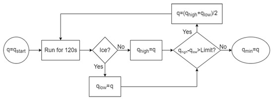 This study aims to determine the minimum required heat loads for anti-icing and de-icing. For anti-icing, the minimum required load was determined by iteratively reducing the power to the heating system until the point when ice accretions became visually observable on the heated surfaces. The tests were conducted on a wing with a conventional IPS design. A flowchart of the iterative procedure is shown in Figure 6. The process started with a heating load qstart that was high enough that in the first step no ice accretion occurred. The value is then halved repeatedly until a heat flux was found where ice occurs. The subsequent heat load was chosen as the mean between the load where ice occurs (qlow) and the load where no ice occurred (qhigh). The procedure continued until the difference between the two loads became smaller than a limit (qlimit ≈ 0.3 kW/m2). In this study, the limit was determined by the smallest step size of the power control unit. This method was applied for the conditions specified in Table 1. Each point was repeated at least two times to verify repeatability.