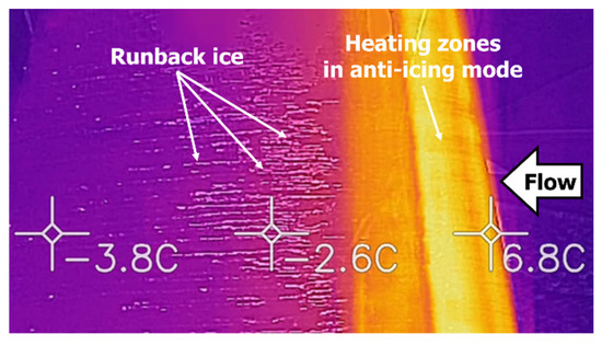 Runback icing occurred during both, anti-icing and de-icing, and can be observed in Figure 7 and Figure 8. In addition to the aerodynamic penalties, runback icing introduces the risk of freezing on downstream control surfaces. This can block their movement and is a severe risk for the UAV [32]. Control of runback icing with an IPS can be achieved for example by multiple heating zones that are operated sequentially.