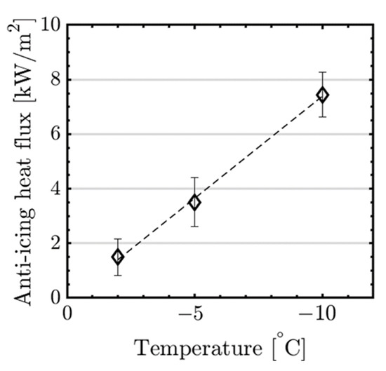 The results for the anti-icing loads are shown in Figure 9. Two runs were conducted each for T = −2 °C and T = −5 °C. Four runs were conducted at T = −10 °C, since it showed a larger variation of the required heat fluxes. This large variation was likely related to the difficulty to identify the exact heat flux when steady-state anti-icing is achieved. The results show a strong linear correlation with the temperature. This behavior was expected and can be explained with the larger temperature difference (between ambient and the freezing point) that needs to be overcome by the anti-icing system at lower temperatures.