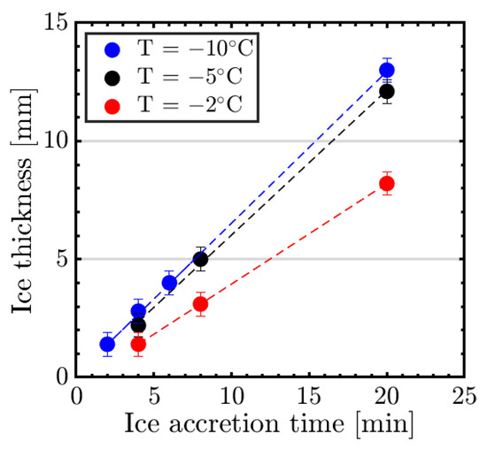 The ice thickness is a key parameter for de-icing and depends on ice accretion time and temperature for v = 25 m/s (Figure 10). The ice thickness showed a good linear fit with the ice accretion time for all temperatures. The highest ice accretion rate occurred at T = −10 °C, and was closely followed by T = −5 °C. At temperatures close to the freezing point (T = −2 °C), the ice accretion efficiency was lower most likely due to the formation of glaze ice. The resulting difference in ice thickness between the temperature was one parameter that affected the shedding times for both IPSs. A remark is that together with thickness, other ice properties have varied (shape, density, and adhesion strength) for the tested temperature range.