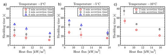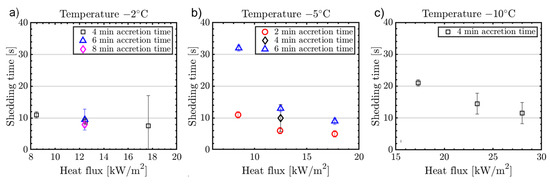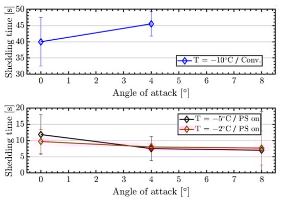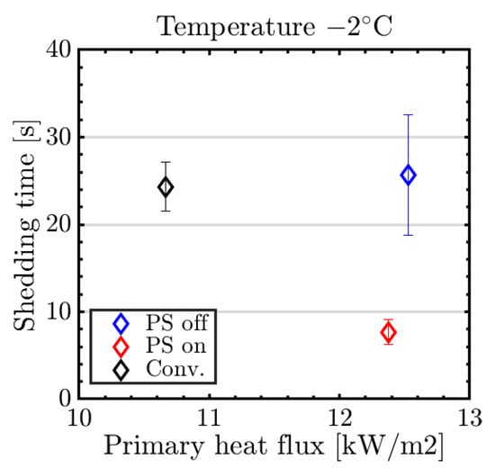 Shedding times for the conventional de-icing system were investigated for a range of ice accretion times, temperatures, and power settings (Figure 11). The results revealed three mechanisms. First, an increase in de-icing heat flux led to a decrease in shedding times. This was most likely related to a more rapid melting process at the ice/structure interface. Second, an increase in ice accretion time led to an increase in shedding time. A 2 min increase in ice accretion time led to an approximate 50% increase in shedding time. This indicated that an increase in ice thickness, and likely consequently higher aerodynamic shedding forces, did not lead to faster shedding times. Instead, a large ice thickness at the leading-edge might be acting as an ice bridge between the upper and lower ice accretion regions. Moreover, the ice was likely kept in place by the stagnation pressure, and longer melting times were needed to achieve shedding. Third, the shedding times increase at lower temperatures. This was most likely related to the larger temperature difference that had to be overcome by the IPS.