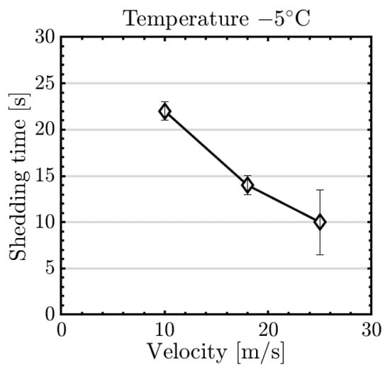The influence of the airspeed was tested at T = −5 °C on the parting strip system for three airspeeds v = [10, 18, 25 m/s]. The water flow rate of the droplet spray nozzles was kept constant, meaning that the LWC was coupled to the airspeed. The corresponding values for each airspeed are LWC = [0.96, 0.69, 0.44 g/m³]. The results (Figure 14) showed a clear trend of a decrease in de-icing time with increasing velocity. This is most likely related to the substantial increase in aerodynamic shedding forces at higher velocities. The aerodynamic forces are kinetic forces and are thus quadratically related to the airspeed [15]. This effect is dominating over secondary effects that would result in a tendency to decrease shedding times for lower airspeeds: first, the increase in LWC leads to larger ice accretions that may lead to a decrease shedding times due to increased drag. Second, the lower airspeeds lead to lower heat convection and thus more efficient heating from the IPS—although this effect might be offset by the higher LWC and larger ice thicknesses. Both these effects were likely subdued by the decrease in aerodynamic forces. In addition, we visually observed that more melting seemed to occur for the lower airspeeds compared to the higher airspeeds.