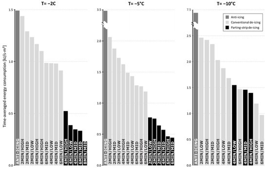 The comparison is performed for each ambient temperature separately (Figure 16). Heat flux levels were indicated with “low”, “mid”, and “high” and their numeric value can be identified from Figure 11 and Figure 12. The first observation was that anti-icing required significantly more energy than all other cases. There was a strong temperature dependency on this effect, which implied that de-icing methods became more efficient compared to anti-icing for lower temperatures. The reason for this was that anti-icing systems need to continuously provide enough heat to compensate for the temperature difference between ambient and freezing point, whereas de-icing systems do this periodically.