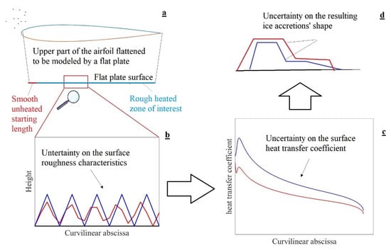 For an iced wing, the quasi-random and unknown characteristics of surface roughness introduce uncertainties in the RANS model. The initial uncertainty on roughness characteristics propagates throughout the thermal correction and ice accretion models, leading to uncertain ice accretion characteristics. Similarly to the previous work of Dukhan et al. [], a rough flat plate geometry is used to model an airfoil, neglecting the pressure gradient effects on the flow. The flat plate represents the upper part of the airfoil, that was unrolled and retains the curvilinear impinging water droplet collection efficiency of the airfoil, as shown on Figure 1a. These assumptions allow for the computing of an ice accretion similar to what is seen on the airfoil, but neglect the curvature effects. Neglecting the curvature effects will produce a slightly underestimated ice thicknesses compared to a curved airfoil. In addition, the absence of positive pressure gradient will increase the boundary layer thickness. This flat plate simplification should not impact the study conclusions, since the sensitivity is ultimately monitored, and not the absolute ice thickness. The epistemic uncertainty is illustrated by two different roughness characteristics (see Figure 1b). Given their geometrical differences, these patterns lead to different convective heat transfer coefficients (see Figure 1c), which in turn cause differences in the characteristics of ice accretions (see Figure 1d).