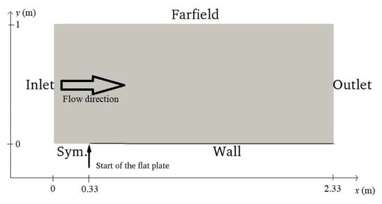 The database needed to obtain the metamodels relies on RANS simulations. The geometry used in the present work is a 2-m-long horizontal flat plate. This geometry is commonly used in CFD validation [], and the mesh size is selected according to a grid study presented in []. The 2D mesh of the domain consists of a structured domain of 137 by 97 cells with 114 points on the flat plate surface. The growth rate in the direction perpendicular to the plate is 1.3, and the y+ value is between 0.45 and 1.35. In a rough configuration, with this mesh, the difference with the experimental results of Hosni et al. [] for the Stanton number evaluation was less than 7% for both the HAX and 2PP thermal correction models. In addition, the flat plate configuration was extensively studied both numerically [] and experimentally [] in the context of aircraft ice accretion studies. The complete 2.33 m by 1 m domain is sketched in Figure 2. The leading edge of the flat plate is located 0.33 m downstream of the domain inlet.