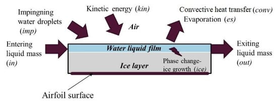 Once the heat transfer along the flat plate is known, the ice accretion simulations can be performed. To compute the 2D ice accretions, the Messinger approach is used [,]. The basis of this approach is to compute the ice growth rate in a control volume using a mass and an energy balance. The control volume and the contributions to the balances are illustrated in Figure 3.
