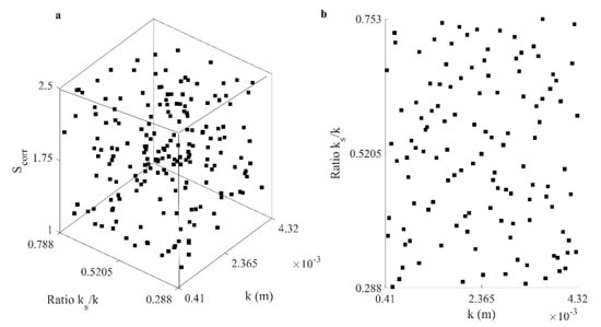 With the range of distribution of each parameter defined, the input parameters can be sampled by Latin Hypercube Sampling (LHS), which is one of the methods commonly used to obtain random, but homogeneously spread, sample points []. The HAX model has 190 sample simulations and the 2PP model 120, for their respective analyses, as shown in Figure 5. These sample size ranges are in agreement with the literature, which gives a sample size between 160 and 200 for a three-input model []. For instance, Solaï et al. used a sample of 115 simulations for their analysis with four input parameters [].
