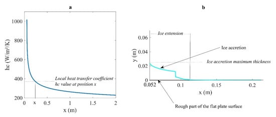 All the sample simulations will give the same global trends, as observed on Figure 6, with variations induced by the roughness from one sample to another. The convective heat transfer coefficient (Figure 6a) will present a maximum value at the stagnation point before decreasing when traveling downstream along the flat plate. For the ice accretion shape (Figure 6b), the maximum thickness will be at the stagnation point, corresponding to the location of maximum collection efficiency (see Figure 4). The thickness will decrease along the plate with the decrease of the collection efficiency. In addition, the runback water will end up freezing, giving the observed step, located, in the example of Figure 6b, at x = 0.08 m. The step is due to the fact that no more liquid water runs back further downstream.