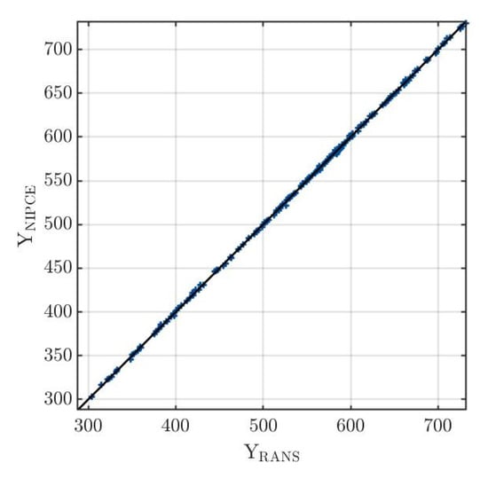 Prior to looking at the LOO error value, the precision of the metamodel may be visualized by plotting the NIPCE prediction for the set of input parameters used for the RANS simulations versus the actual RANS calculated value. Figure 7 shows this scatter plot for the metamodel M1 of the HAX model. YRANS represents the RANS-calculated values of the local convective heat transfer coefficient at x = 11.36 cm (with x = 0 taken at the very beginning of the flat plate), while YNIPCE represents the corresponding values predicted by the metamodel. The points for the 190 sample simulations are plotted and show that the metamodel M1 for the HAX model has a good precision, with an absolute mean error between the RANS-calculated values and the NIPCE-predicted values of 0.90 W/m2/K and a linear regression coefficient of 0.9999. This regression coefficient value is higher than the ones commonly accepted in the literature for sensitivity analysis []. The LOO error for this metamodel, M1, at x = 11.36 cm is 4.25 × 10−4. The local position x = 11.36 cm was chosen among the 114 possible surface grid points to illustrate the behavior of the metamodel.
