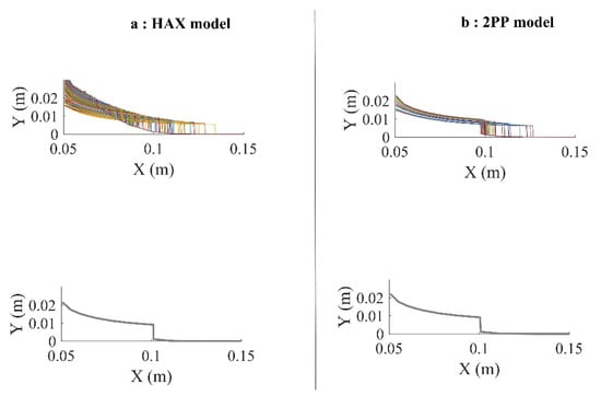 Figure 10 shows that the two thermal correction models predict different maximum ice thickness ranges: the 2PP model gives ice accretions with thicknesses of up to about 23 mm, while the HAX model predicts thicknesses of up to 33 mm.