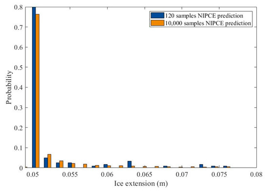 Figure 9 shows a similar trend. A closer analysis allows for the determination of the PDF of the data in the figure. The fitted normal distributions, associated to the histograms of Figure 9, have their parameters μ and σ summarized in Table 4, with the 95% confidence intervals in square brackets. The first column in Table 4 gives the parameters for the NIPCE prediction histogram of Figure 9 obtained with 120 samples, and the second column gives the PDF parameters as extracted from the prediction with 10,000 samples. Note that the NIPCE metamodel obtained, defined by a polynomial as in Equation (10), in both the sample sizes (120 and 10,000), is of degree 7.