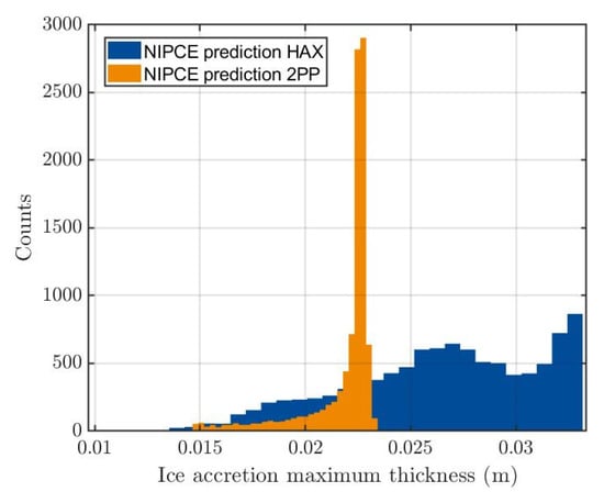 The data in Table 5 show that each thermal correction model predicts slightly different output PDFs for the same metamodel. The μ values in Table 5 show that, statistically, changing from the HAX to the 2PP thermal correction model leads to a 21% variation in the heat transfer coefficient. This change in the heat transfer coefficient then leads to a 17% variation in the ice maximum thickness and only 1.8% of change in the ice extension. The standard deviation σ allows us to estimate the relative uncertainty and how the observed values spread around the mean μ. For a normal distribution, 99.7% of the data are in the range [μ − 3σ; μ + 3σ]. The σ values in Table 5 suggest a larger uncertainty on the outputs for the HAX model compared to the 2PP model. For the ice extension, the relative uncertainty in the 99.7% range [μ − 3σ; μ + 3σ] is about 36% for the HAX model and 27% for the 2PP model. The same calculation for the maximum ice thickness leads to a relative uncertainty of 52% for the HAX model and 23% for the 2PP model. As expected, these uncertainties on the accretion find their origin in the heat transfer uncertainties, which are 58% and 19% for the HAX and 2PP models, respectively. As an example, Figure 10 shows the difference in the distributions predicted by metamodel M2 for the maximum ice thickness. The difference between the distributions predicted for the HAX model (orange) and the 2PP model (blue) is noticeable. The larger standard deviation for the HAX model is clearly visible, with a larger spread of the values around the mean compared to the 2PP model.