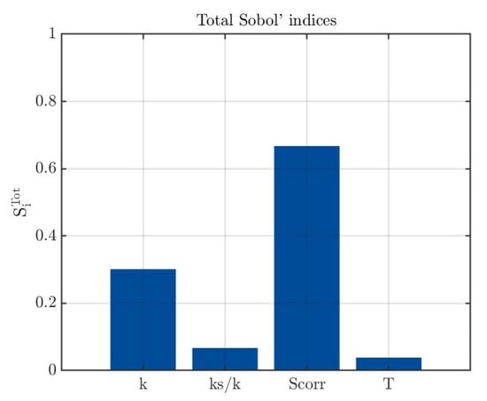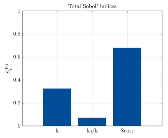 According to Chan et al. [], a parameter with a total Sobol index greater than 0.8 can be considered as “very important”, with the total Sobol index between 0.5 and 0.8 as “important”, between 0.3 and 0.5 as “unimportant” and “negligible” with an index below 0.3. Consequently, in the present icing application, a total Sobol index close to 1 characterizes an input parameter having a big effectiveness and influence on the ice accretion.