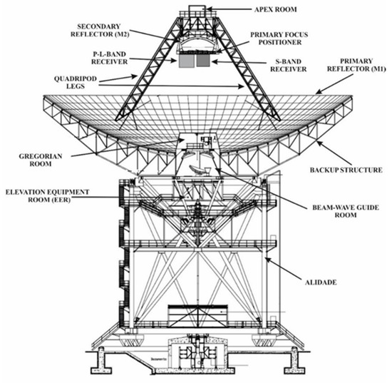 The BIRALET system is a bistatic radar configuration located in Sardinia (Italy). The transmitter of the BIRALET is the TRF (Trasmettitore a Radio Frequenza—Radio Frequncy Transmitter), a 7 m fully steerable wheel-and-track parabolic antenna with a primary focus configuration, located in the region “Salto di Quirra” (Northeast from Cagliari). The azimuth and elevation range of the transmitting antenna are 0–360 deg and 0–90 deg, respectively, with an accuracy of 0.1 deg and a speed of 3 deg/s in both directions [8]. The TRF is capable of transmitting a continuous wave (CW) signal of 10 kW at 410 MHz. The receiver of the BIRALET system is the SRT, a 64 m fully steerable wheel-and-track parabolic antenna (Figure 1) devoted mainly to radio astronomical observations, located in Pranu Sanguini (Northeast from Cagliari), operating in the frequency range from 0.3 to 116 GHz. In addition to the 64 m primary parabolic mirror, the antenna is equipped with a 7.9 m secondary mirror and the beam waveguide system (BWG), which includes two 2.9 m mirrors and one 3.9 m mirror, for a total of four focal positions [16,17,18,19,20]. To better clarify the mirrors and foci configuration of the SRT, a sketch of the antenna is reported in Figure 2, whereas Table 1 summarizes the key features of the radio telescope. One of the peculiarities of the SRT is the active surface system that allows the modification of the profile of the primary mirror (by means of an electro-mechanical control) in order to compensate for deformations tied to gravitational load, pressure of the wind, and thermal gradients [21].