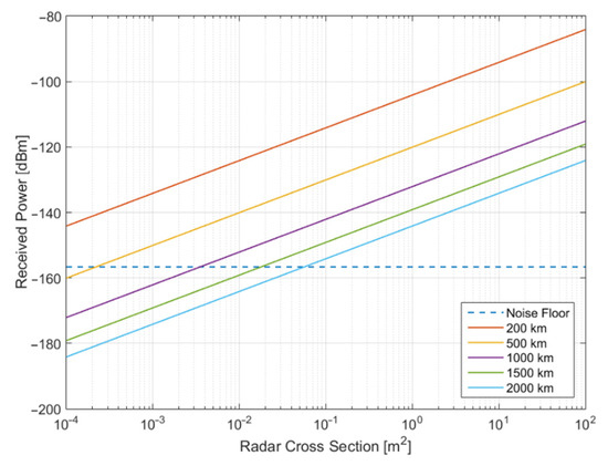 where is the Boltzmann’s constant; is the system temperature (as sum of the antenna and receiver temperature); and is the noise bandwidth, evaluated as the bandwidth of the output filter of the receiver. Figure 3 shows the simulated performances of the BIRALET system in terms of received power versus RCS for the range of values from 200 to 2000 km. The estimated signal-to-noise ratio (SNR) for a specific RCS can be derived easily by the difference between the received power and the noise floor. It is worth mentioning that the latter represents an ideal estimation of the SNR received, because, in a real measurement, the noise floor tends to be higher.