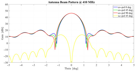 The receiver employed for the space debris observations is the P-band receiver, working between 305 and 410 MHz [13,23]. The receiver block is composed of five main sections: the coaxial feed, the cryogenic front-end, the linear to circular polarizer, the noise calibrator and antenna unit injection, and the filter selector. The radio frequency (RF) signal is received by the coaxial feed and sent to the cryogenic front end, directly connected to the noise calibration and antenna unit injection, for the calibration of the entire system. Then, the signal is sent to the polarizer, which allows the retrieval of the signal in both linear and circular polarizations. The last stage is the choice of a suitable filter depending on the type of measurement. More details on the P-band receiver can be found in [23]. The half-power beamwidth (HPBW) of the SRT in P-band (410 MHz) is about 0.8 deg, as shown in the radiation pattern reported in Figure 4.