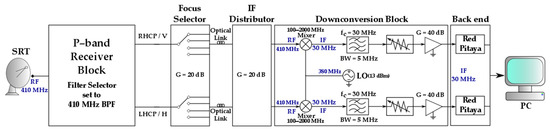 The P-band receiver block is the first part of the space debris dedicated channel of the SRT. A complete schematic of the channel is reported in Figure 5. After the P-band receiver block, the signal goes in input to the focus selector, which allows the choice of the focus for the observation (the primary focus in our case). This section is characterized by a set of filters, amplifiers, and attenuators, providing an overall gain of about 20 dB. From the top of the parabolic reflector, the signal is then carried down to a shielded room at ground level, by means of a 500 m optical link. Inside the shielded room, downstream to the optical link, the signal passes through the IF distributor, which allocates the signals coming from the antenna to the different back-ends, and is characterized by an overall gain of about 20 dB.