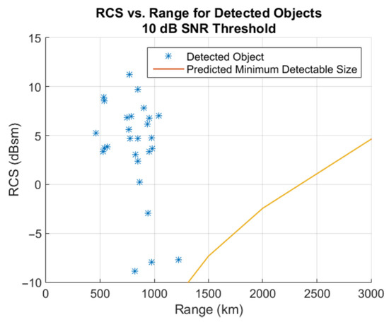Scatter plot of RCS vs. range for the detected objects with respect to the minimum detectable size by the BIRALET system. SNR, signal-to-noise ratio.
