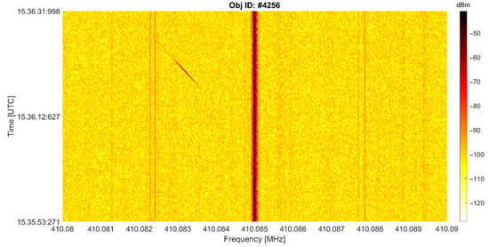 As mentioned in Section 2, the data recorded by the back-end are acquired in a row format that can be later post-processed. These refined data are displayed in a spectrogram fashion, showing the duration of the passage, frequency, and power. An example of a time–frequency spectrogram is reported in Figure 8, for the object 4256, which is characterized by an RCS of 0.51 m2, an altitude of 918.1 km, and a range of about 941.5 km.
