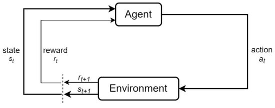 Formally, RL can be described as a Markov Decision Process (MDP) and defined as a tuple (S, A, P, R, ), where S is the set of states, A is the action set, P is the transition function, R is the reward function, and is a discount factor, which is used to give less relevance to rewards occurring far into the future. At each time step t, the agent is in a state and it selects an action . It then moves to the next state and receives a reward , which indicates how good the selected action was. This interaction is represented in Figure 1. To select an action, the agent follows a policy, which is a mapping from states to actions. The policy defines the behavior of the agent.