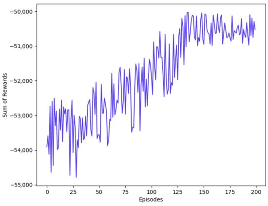 Figure 5 presents the sum of rewards that were obtained by the agent over each training episode. In the beginning, the lack of experiences collected by the agent, combined with higher exploration rates, results in lower rewards. Although, as the agent learns, the obtained rewards get higher over time, until it reaches convergence around episode 140.