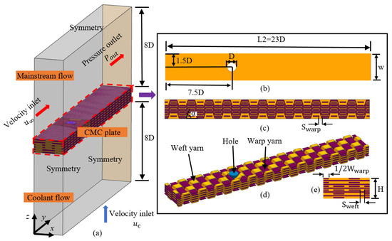 Figure 1a shows the numerical model of 2.5D braided CMC plate with a film-cooling hole, which consists of four parts: film-cooling hole, mainstream flow region, coolant flow region, and 2.5D braided CMC plates. The diameter (D) and the injection angle of the film cooling hole are 2.4 mm and 90°, respectively. The mainstream flow region and coolant flow region extend 7.5D upstream from the center of the film-cooling hole and 15.5D downstream. The span-wise spacing of the film-cooling hole is 3D. The size of these two regions is 23D × 3D × 8D (length × width × height). Figure 1a,b show their detailed dimensions.