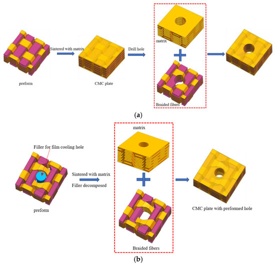 The numerical model in this paper involves four physical models for different manufacturing processes of holes. The difference lies in the changes of fiber-braiding structure around the film-cooling holes. Generally, the manufacturing processes of holes have two different methods, including the drilled hole and the preformed hole. For the drilled hole, firstly, the preform is woven by fibers, and the preform is compounded with the matrix material to obtain CMC material. Then the holes are drilled directly into the finished braided material, and the film-cooling hole can be obtained by breaking the fibers and removing the matrix at the corresponding position. The manufacturing schematic diagram of the drilled hole is shown in Figure 2a. For the preformed hole, firstly, the filler of the required film-cooling hole is manufactured, and the filler is placed at the position of the film-cooling holes. The preform fiber directly bypasses the film-cooling hole filler to preform the film-cooling holes. Then, the preform and the matrix material are composite sintered to make CMC components; in the manufacturing process, the film-cooling holes’ filler can be directly decomposed in the sintering process, such as with graphite and other materials. A special solution also can be used to decompose the film-cooling hole filler after the CMC component is sintered without damaging the CMC component. The shape of the preformed hole is guaranteed by the filler. In this paper, the filler of the film-cooling hole is a straight cylinder. The manufacturing schematic diagram of the preformed hole is shown in Figure 2b.