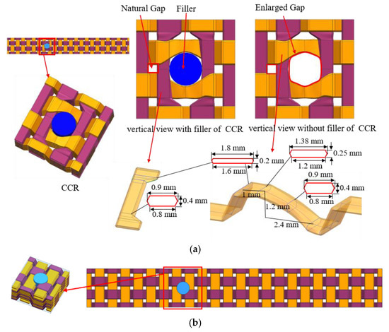 When the preform is braided, there will be a natural gap with the size of Swrap × Sweft between the fibers, as shown in Figure 3a. The EP-Hole is based on the natural gap between the braided yarns, which is enlarged to form a film-cooling hole. The EP-Hole is located between two weft yarns and two warp yarns. When weft and warp yarns are woven to the filling position of the hole, the fiber is squeezed by the filler, deforming and bypassing the filler at the same time. When the preform is sintered with the matrix, the ceramic matrix will fill the gaps between the preform fibers. At the same time, due to the existence of filler, the matrix material will not fill the filler area, and eventually leave a film hole with the same shape as the filler.